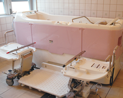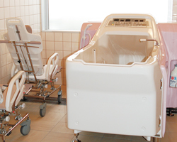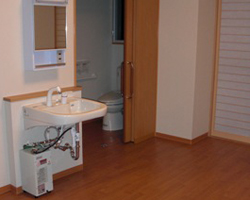 1階に機械浴(チェア浴)、2階に機械浴(寝浴・座浴)を設置したことで、さまざまな状態の利用者が入浴できます。小規模多機能ホームと併設されていることから、4~5人同時に入浴可能な一般浴も利用可能で利用者との入浴中の交流も行えます。 浴室、脱衣室はもちろんトイレには、手すりを設置しバリアフリー対応により転倒防止や危険防止に配慮しています。また、各居室のトイレはすべて外部に面した配置とし、においの排出に工夫を凝らしてあります。