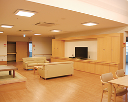家庭的な雰囲気が入居者が自由に交流できる広々としたリビングルーム。 ユニット内の居間・食堂は、入居者同士が交流する場所として重要なスペースであることから車椅子での移動が、容易に行える広さを確保してあります。 居間・食堂の壁面には作り付けの家具を設置し、テレビはもちろん家庭にあるような置物も飾りやすくなっている。
